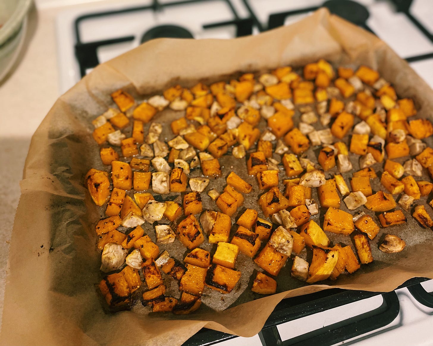 3. Stir well so that all the cubes of veg are evenly coated, pop onto a lined tray and bake in the oven for about 25 minutes or until soft in the centre and browned on the outside (see image). Use this 25 minutes of waiting to relax - have a bath, read your book, listen to a podcast.